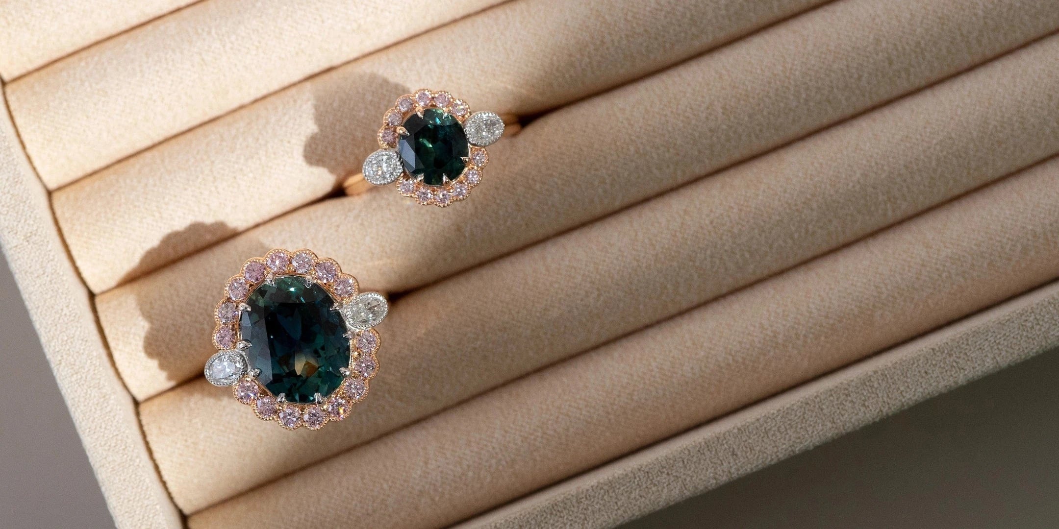 Crafted in the Hogans workshop, these cluster style dress rings feature teal hued oval cut Australian sapphires set amongst a combination of white and Australian pink diamonds to create a finely nuanced combination of contrasting colours. With a rating of 9 Mohs' on the hardness scale, second to only diamonds, these sapphires are known for their durability and have risen to popularity as a unique gemstone choice for all fine jewellery, particularly engagement rings. For more details on these rings, please enquire now.