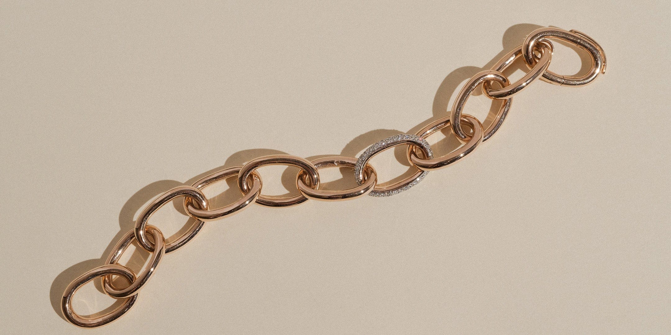 For this reason, we are honoured to introduce one of the latest bespoke creations designed and handcrafted within the Hogans workshop. Made from custom-mixed 9k champagne gold, this bracelet showcases meticulously crafted elongated oval-shaped interlocking links, reminiscent of a modern paper-link design. From custom-mixing the gold colour to rolling out the material and carefully shaping each individual link, every step of the process has been completed by hand, making this piece a true work of art.