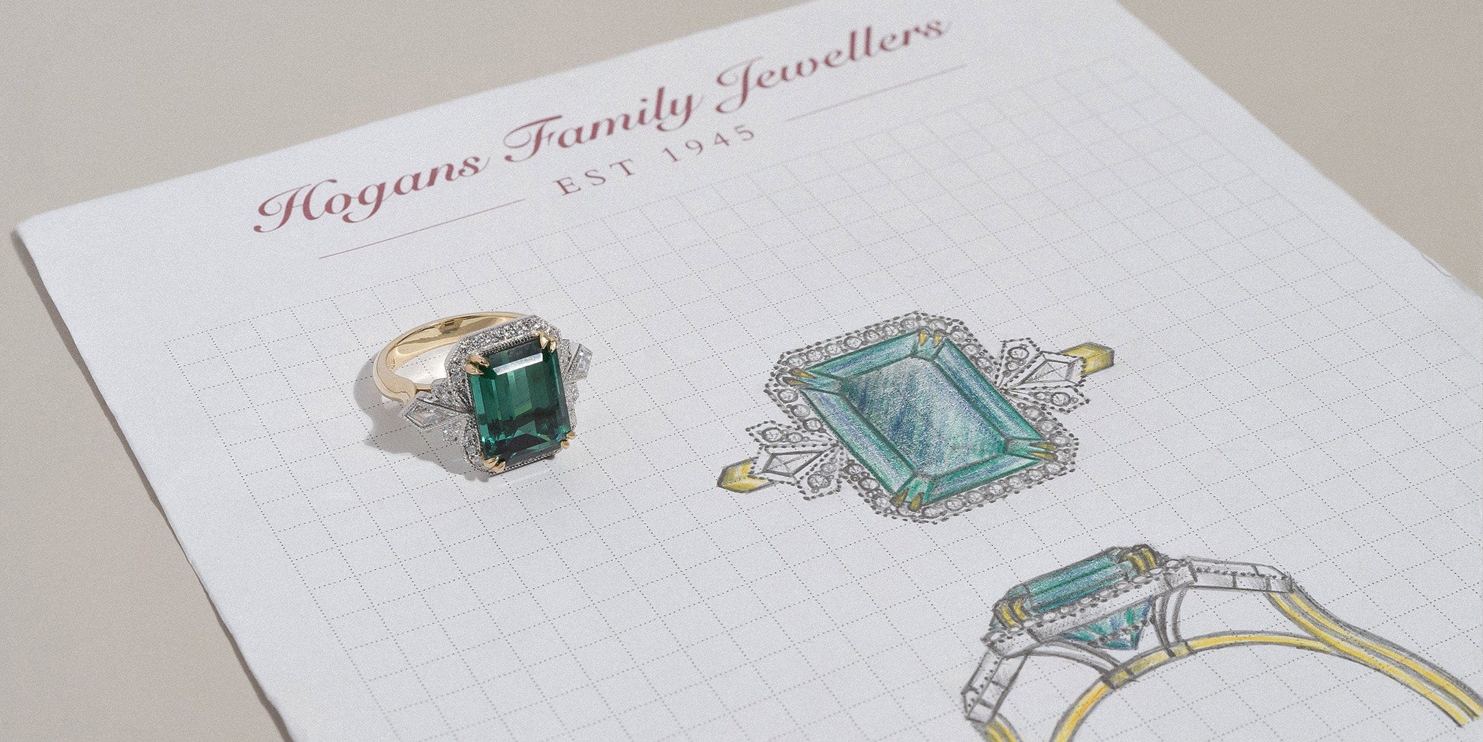 Crafted in 18k yellow and white gold, featuring elements reminiscent of the Art-Deco period, this piece champions a vibrant 6ct emerald cut forest green-hued tourmaline gemstone. Accompanying the centrepiece is a tri-cluster of kite and round brilliant cut diamonds, finished with a halo of petite round brilliant cut diamonds set in milgrain beading. Today, we speak to the members of the Hogans team that were involved in the design and crafting process to dive deeper into the meaning behind the ring, along with the techniques used and challenges that they encountered when assembling and setting it.
