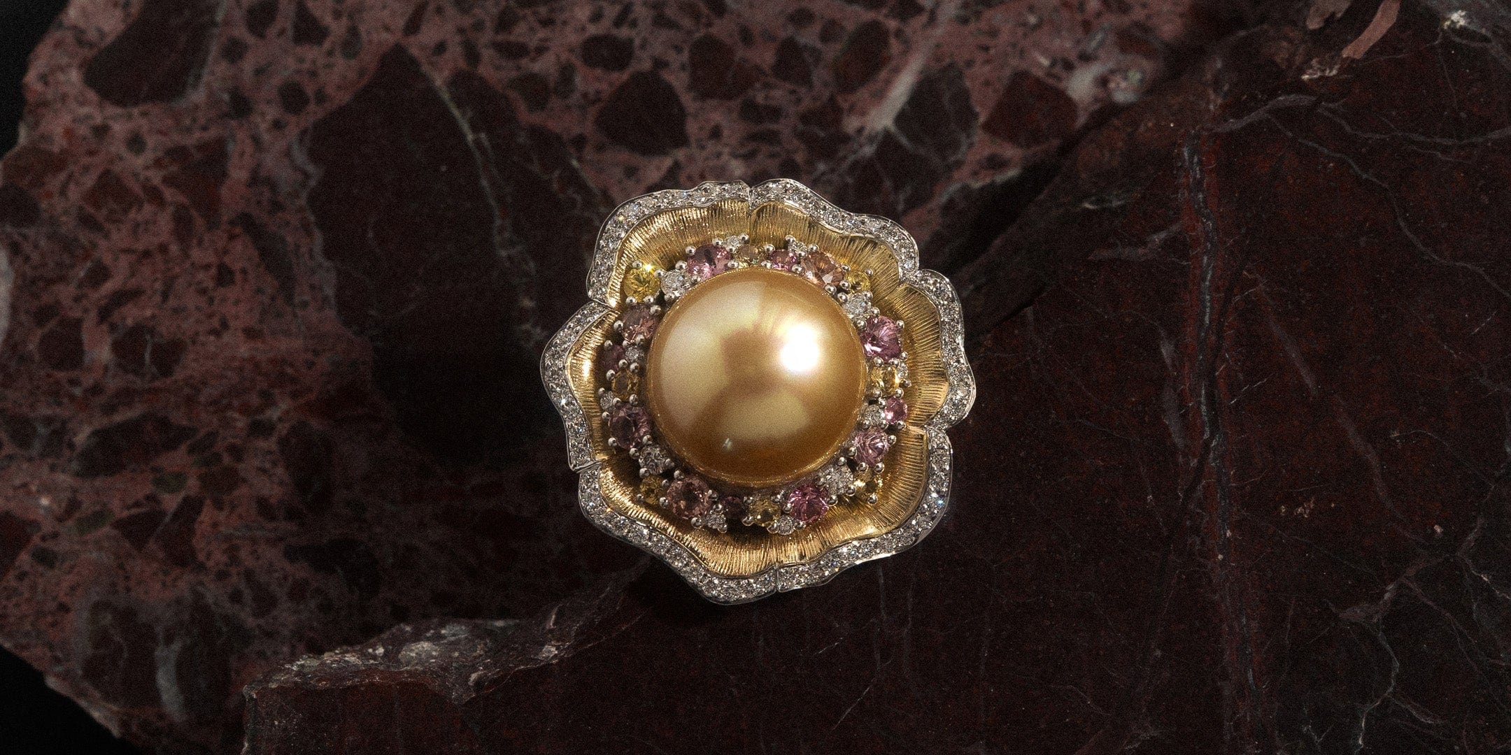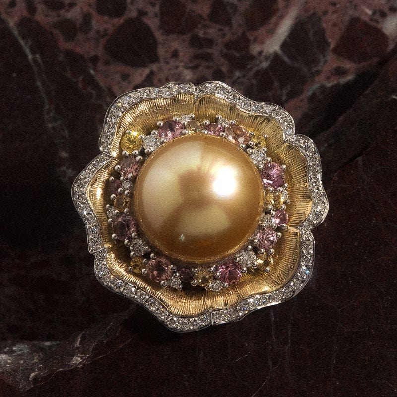 A: We started with the golden South Sea pearl and built upon that as the foundation of the design. Our aim was for the ring to evoke images of both coral reefs and garden beds, capturing the delicate beauty of nature. I carefully handpicked the collection of sapphires to reflect the soft, luminous quality of the pearl. These sapphires truly bring life and vibrancy to the piece, and I was very conscious that they needed to be of the highest quality. To add further depth and contrast, we enhanced the polished gold on the outside of the petals by incorporating a textured finish on the inside.