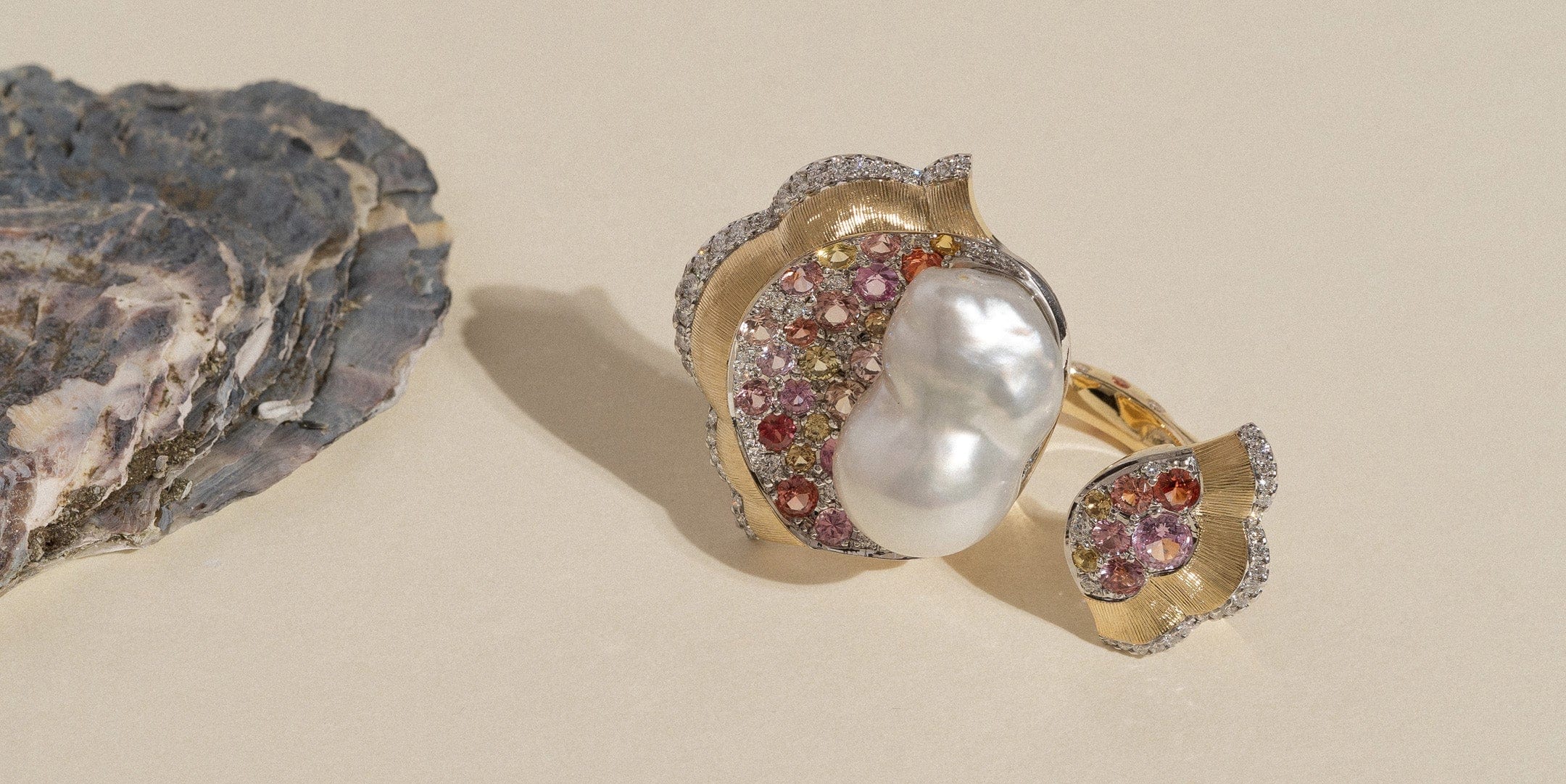 A: The natural shape of the baroque pearl played a central role in the design. Its irregular, freeform nature allowed us to create a ring that feels organic, but we also wanted to ensure it was practical. While freeform designs can sometimes feel too earthy, we balanced the pearl’s natural beauty with structured elements to give the ring a refined, vintage-inspired feel.