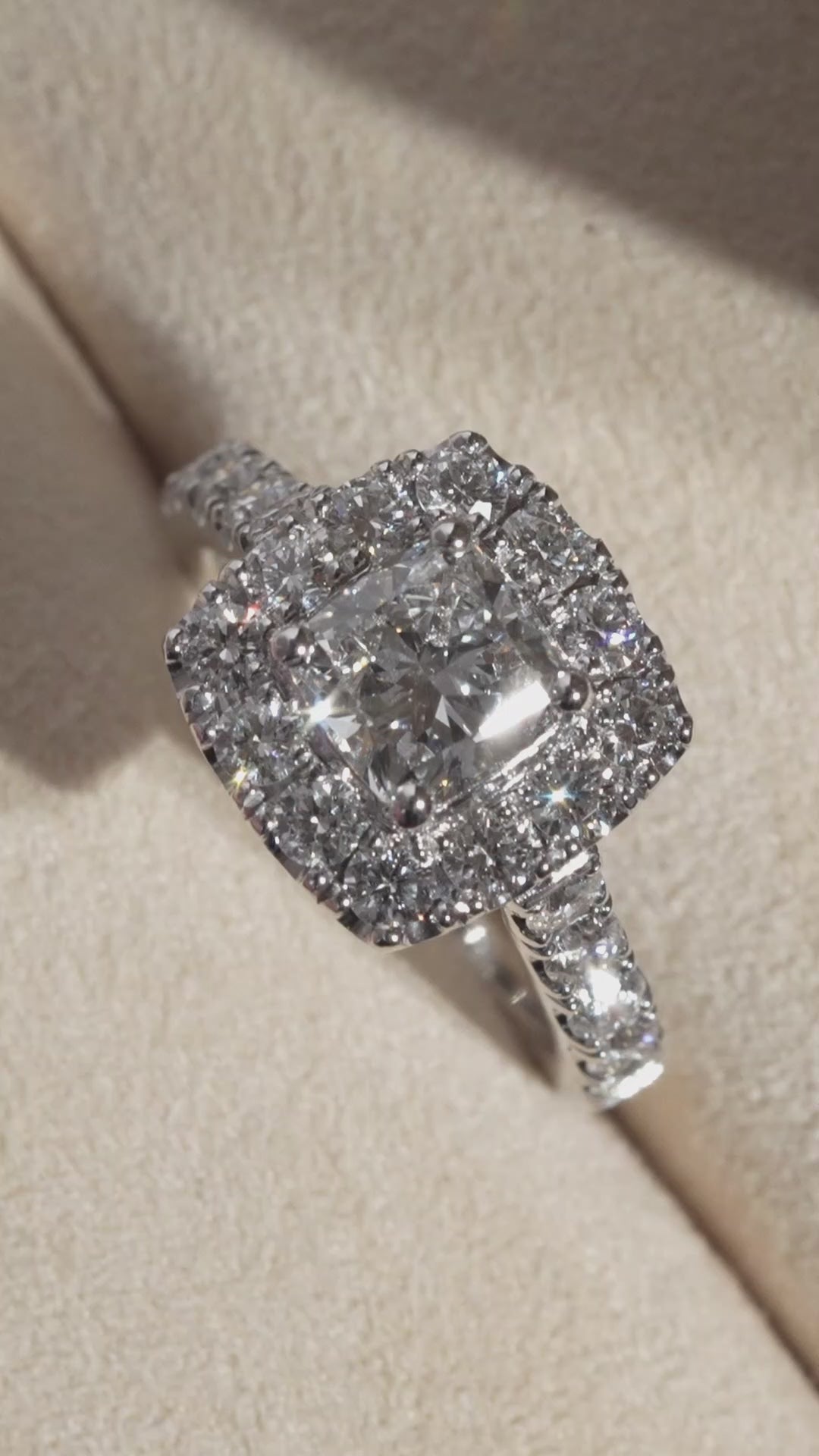 Crafted in 18k white gold, this breathtaking cluster ring features a 1.04ct GIA Certified cushion cut white diamond centre stone, encased in a round brilliant cut white diamond halo, and with a complementary diamond set band.