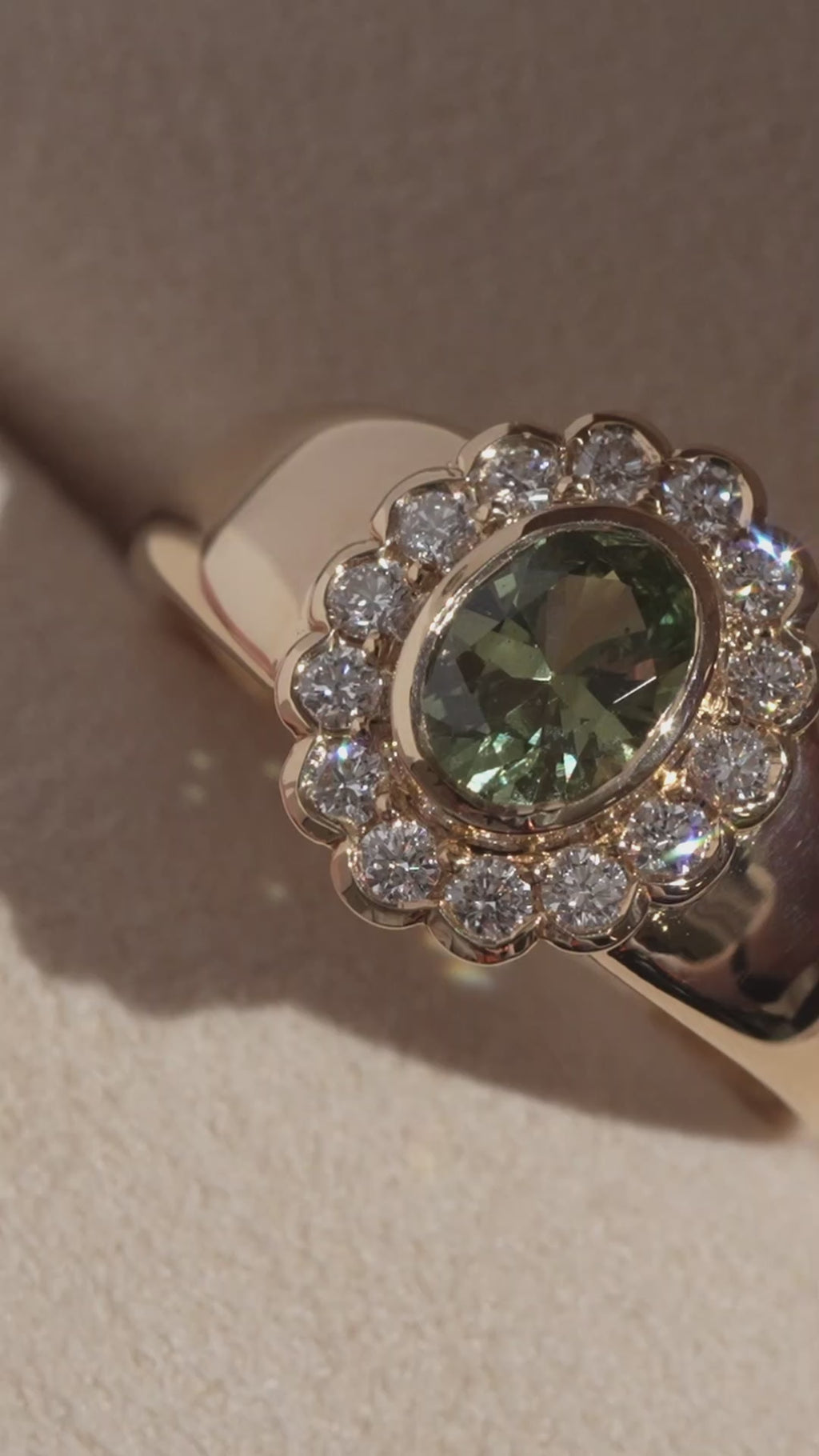 Crafted in 18k yellow gold and part of our daisy signet collection, this stunning ring features an oval cut green Australian sapphire centre stone, framed by a halo of round brilliant cut white diamonds, and finished in a timeless bezel setting.
