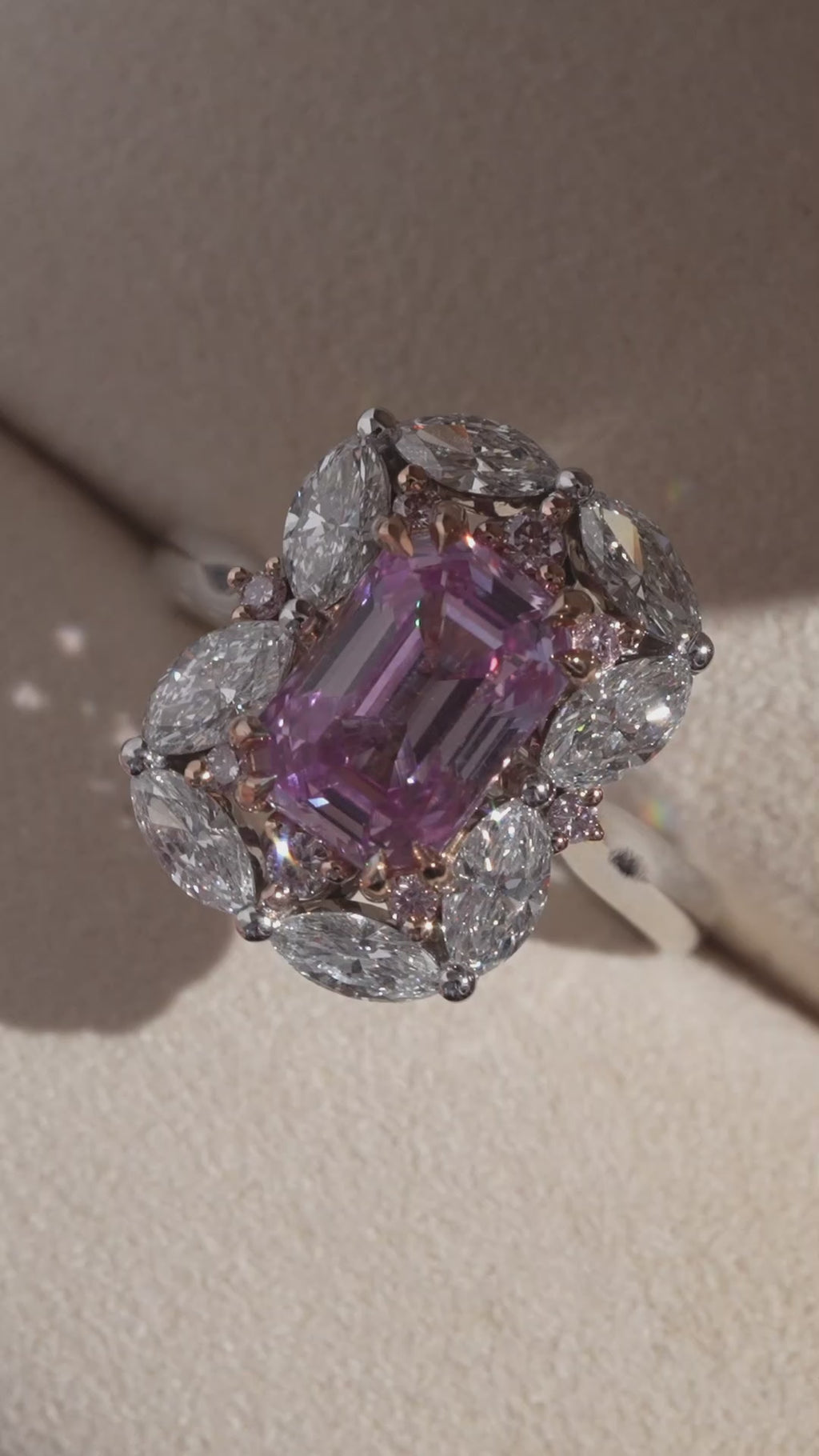 Crafted in 18k white and rose gold, this cluster style ring features a stunning radiant cut pink sapphire centre gemstone, encased by a halo of round brilliant cut Australian pink diamonds and marquise cut white diamonds.