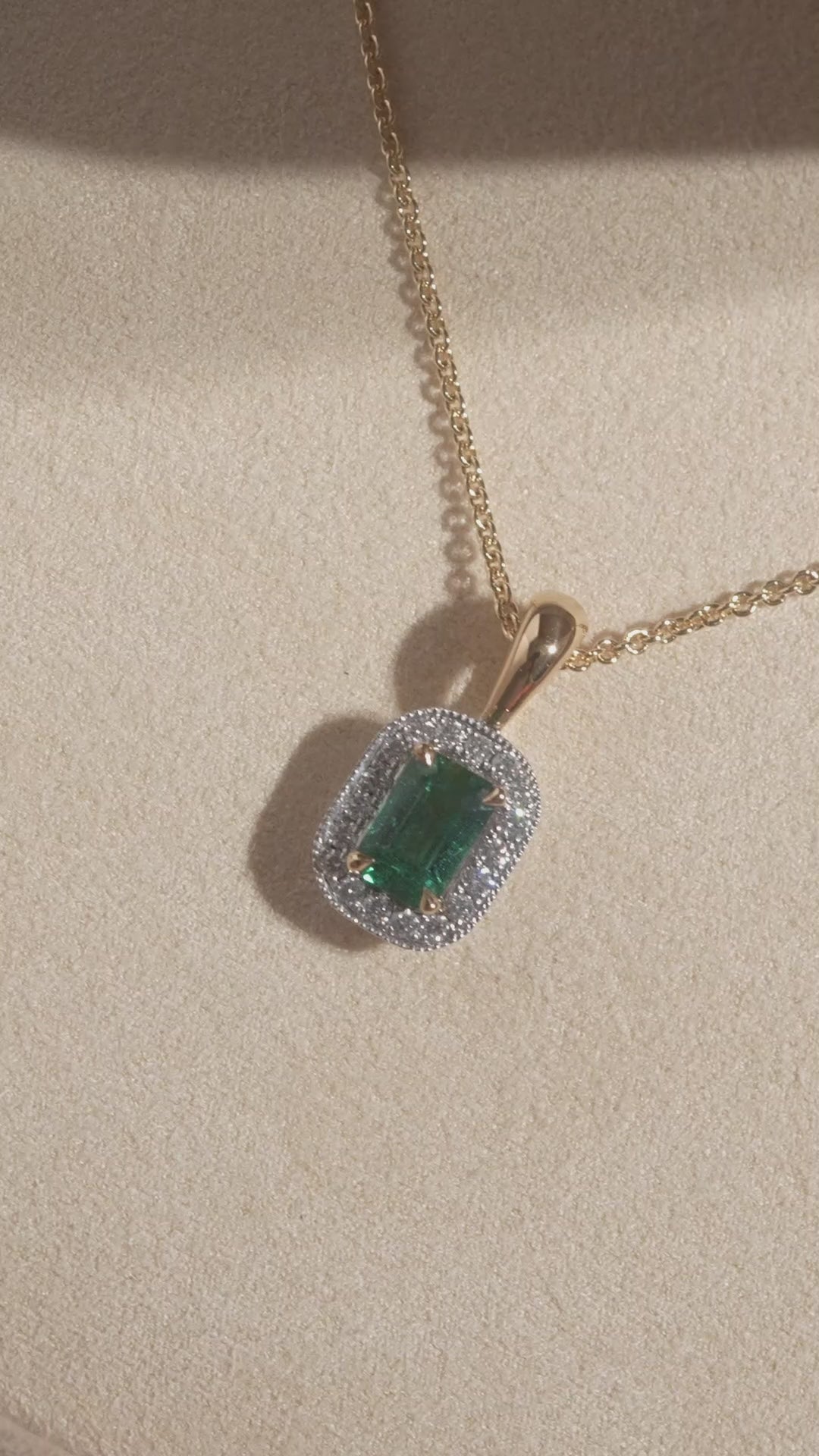 Hogans Family Jewellers 18K YWG Emerald Cut Emerald Halo Pendant