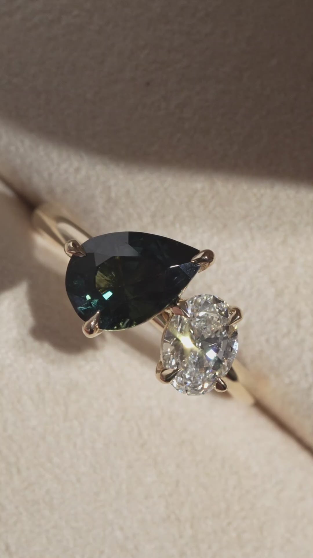 Crafted in 18k yellow gold, this toi et moi style ring features a vibrant pear cut sapphire gemstone paired alongside a high quality oval cut white diamond.