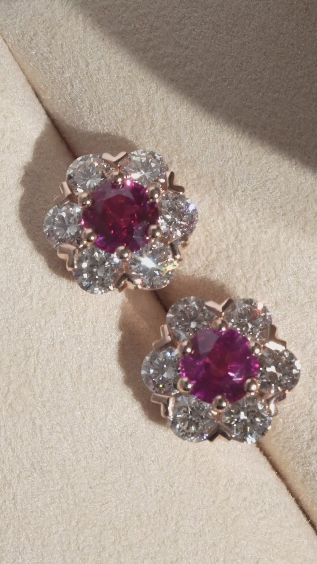 Crafted in 14k rose gold, these stud earrings feature a round-cut Burmese ruby centre stone bordered by a row of brilliant cut white diamonds.